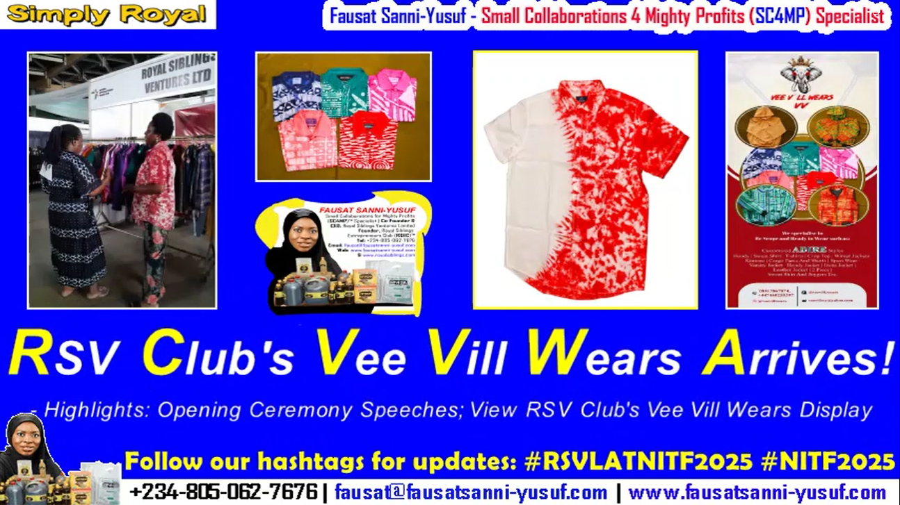 Inner Caucus Royal Siblings Entrepreneurs (RSE) Club Member – Mr. Victor Onifade – and members of his “Vee Vills Wears” Fashion Brand team joined Fausat at RSE Club’s SC4MP Exhibition Booth!