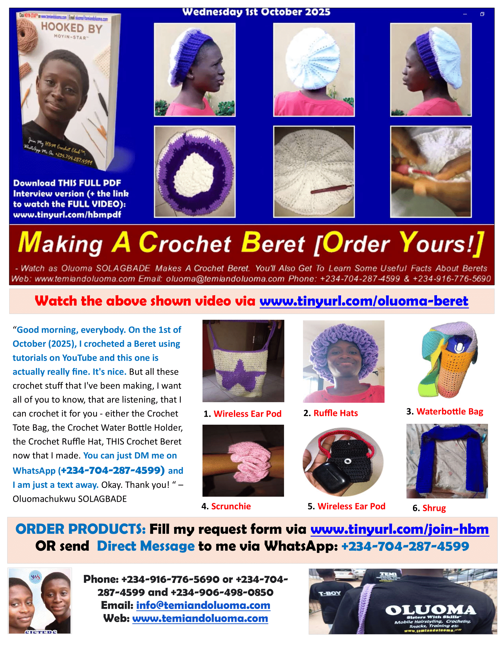 But all these crochet stuff that I’ve been making, I want all of you to know, that are listening, that I can crochet it for you – either the Crochet Tote Bag, the Crochet Water Bottle Holder, the Crochet Ruffle Hat, THIS Crochet Beret now that I made. You can just DM me on WhatsApp (+234-704-287-4599) and I am just a text away. Okay. Thank you!” – Oluoma SOLAGBADE